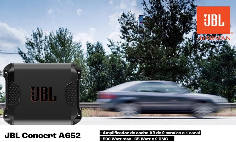 The JBL Concert A652 is a high-performance 2-channel Class AB car amplifier designed to deliver clear and powerful sound to your vehicle’s audio system. It provides 2 x 65 Watt RMS output for driving two car speakers or can be bridged to deliver up to 170 Watt RMS to a single subwoofer, with a peak power of 500 Watts. This amplifier is ideal for enhancing your car audio experience with JBL’s renowned sound quality and reliability.