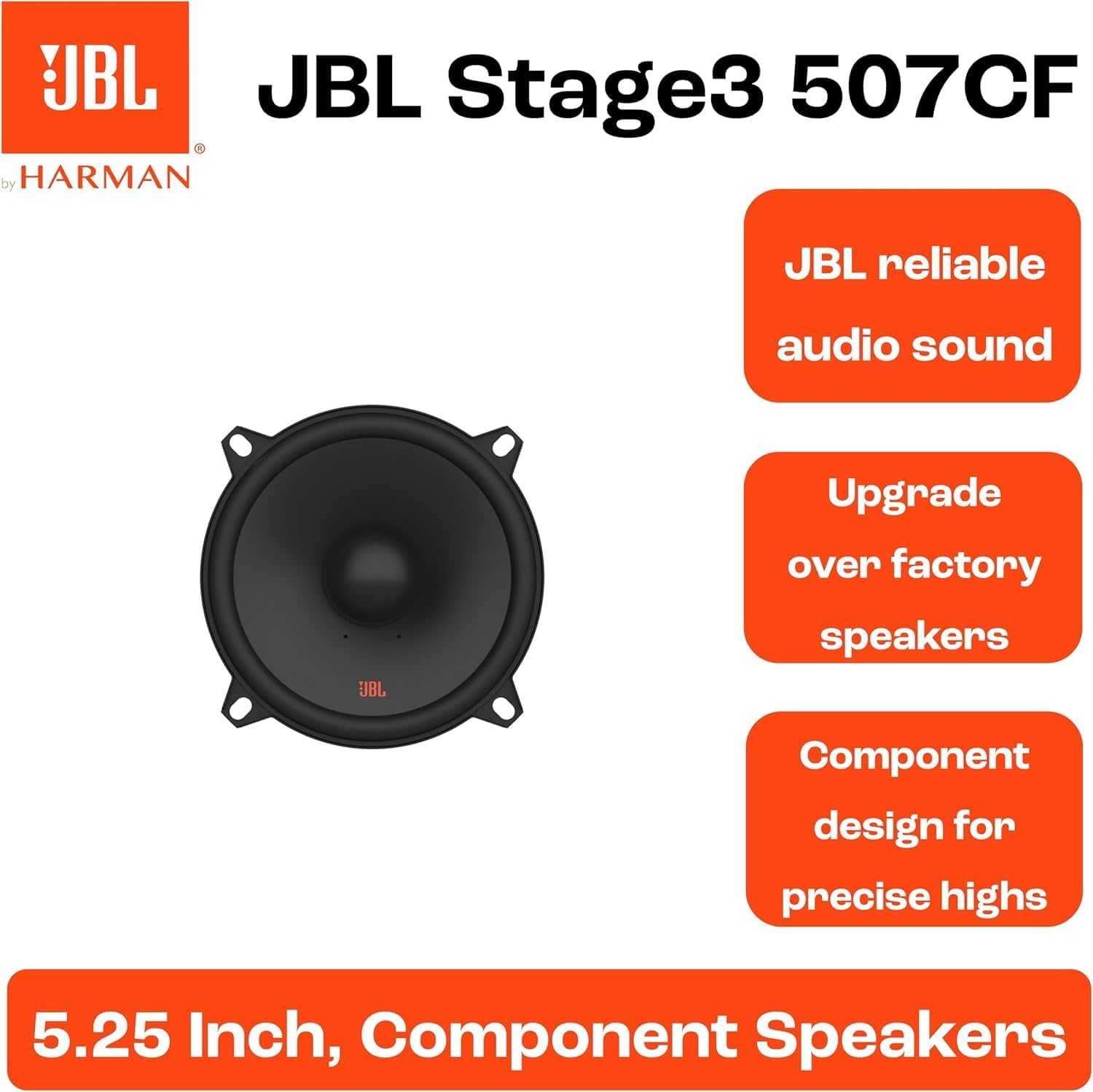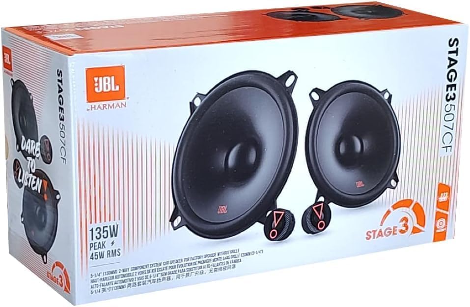 The JBL Harman Kardon Stage3 507CF is a high-quality 2-way component car speaker set designed to deliver clear and powerful sound for your vehicle. Featuring a 13 cm (130 mm / 5 inch) woofer and a 3.25 cm tweeter, this speaker set provides balanced audio performance with crisp highs and rich lows. The speakers come in a sleek black finish and include a speaker box set without grille, making them a great choice for car audio enthusiasts seeking enhanced sound clarity and style.