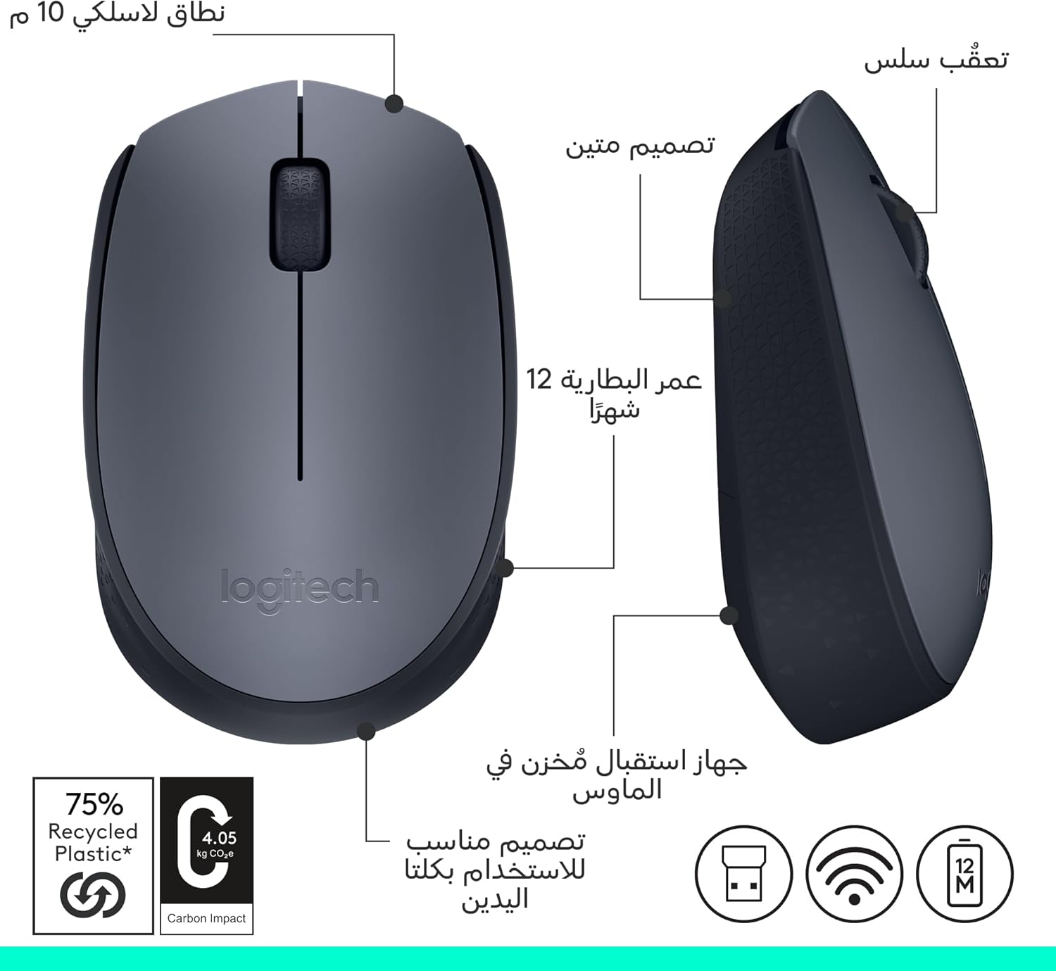 The Logitech M170 Wireless Mouse offers reliable and convenient wireless connectivity through a 2.4 GHz USB nano receiver. Designed with an ambidextrous shape, it provides comfortable use for both left and right-handed users. The optical tracking technology ensures smooth and accurate cursor movement, making it ideal for everyday computing tasks on PC, Mac, or laptops. With a battery life lasting up to 12 months, this mouse delivers long-term performance without frequent battery changes.