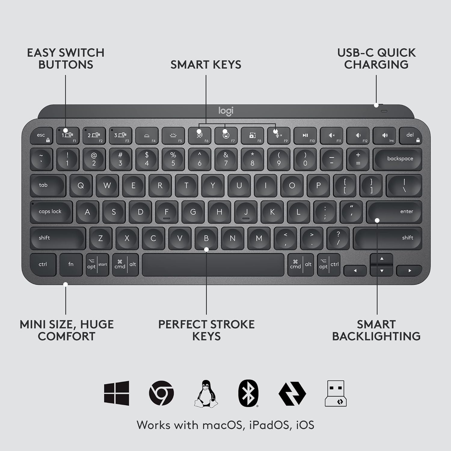 The Logitech MX Keys Mini Combo for Business offers a compact and efficient wireless keyboard and mouse set designed for professional use. Featuring Logi Bolt technology, it ensures a secure and robust connection, ideal for busy work environments. The combo supports Bluetooth connectivity and is certified compatible across multiple operating systems including Windows, Mac, Chrome, and Linux, providing versatile usability. Its sleek graphite finish complements any workspace.