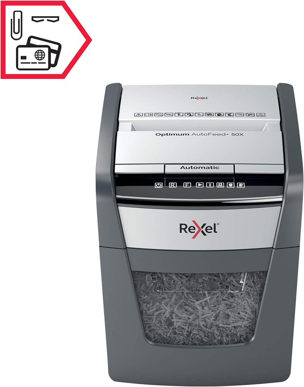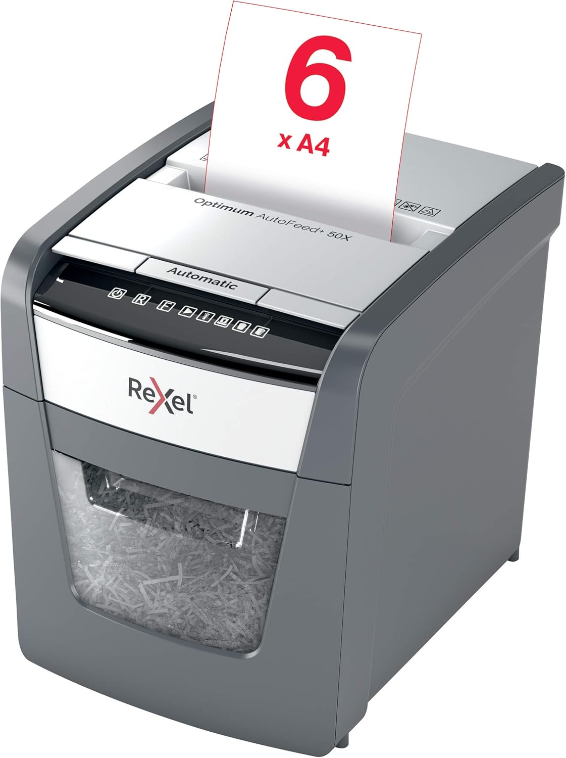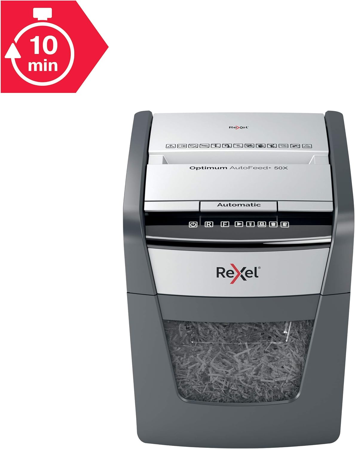The Rexel 2020050X paper shredder is designed for home and office use, offering efficient and secure document destruction. Featuring a 20-liter removable bin, it supports automatic feeding of up to 50 sheets, making shredding large volumes hassle-free. The shredder uses optimum cross cut technology to ensure documents are destroyed to P-4 security standards, protecting sensitive information effectively. Its sleek silver design fits well in any workspace, and the product comes with a 1-year full warranty for peace of mind.