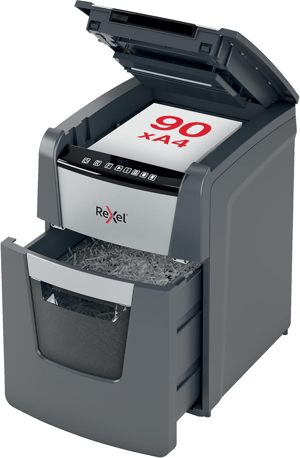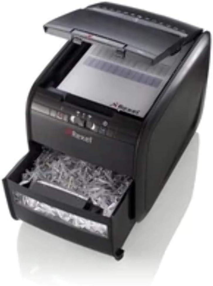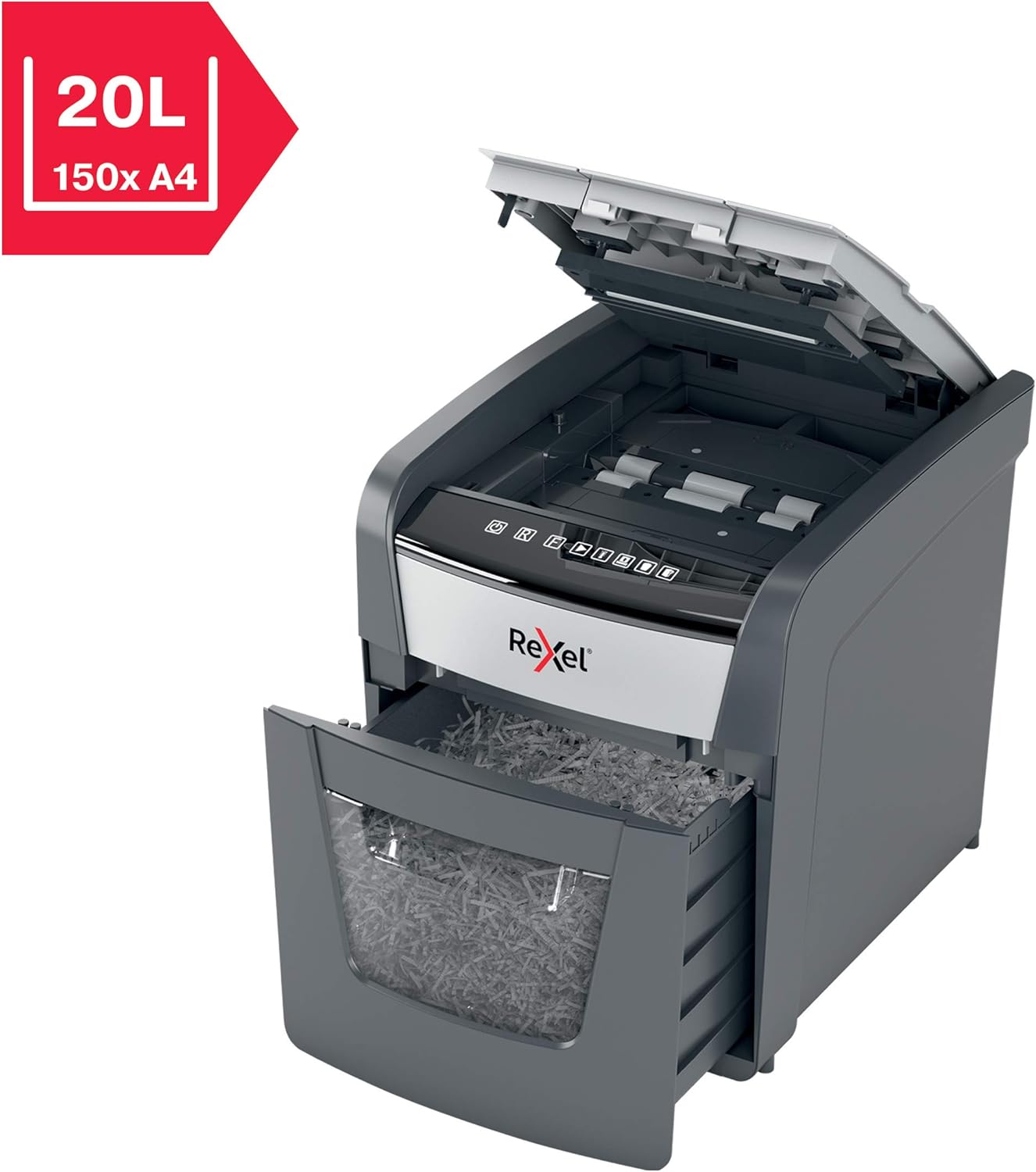 The Rexel 2020050X paper shredder is designed for home and office use, offering efficient and secure document destruction. Featuring a 20-liter removable bin, it supports automatic feeding of up to 50 sheets, making shredding large volumes hassle-free. The shredder uses optimum cross cut technology to ensure documents are destroyed to P-4 security standards, protecting sensitive information effectively. Its sleek silver design fits well in any workspace, and the product comes with a 1-year full warranty for peace of mind.