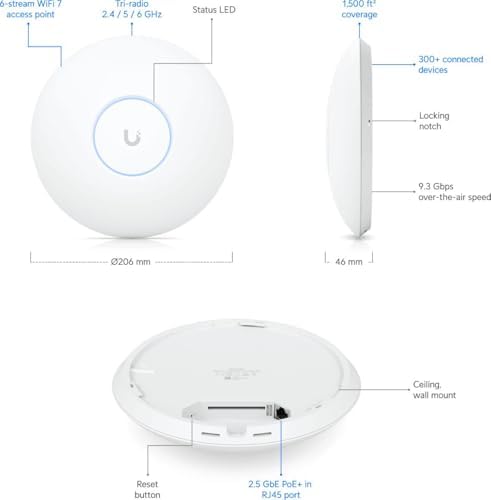 The Ubiquiti UniFi U7 Pro is a professional-grade indoor access point designed to deliver high-speed wireless connectivity with the latest WiFi 7 technology. Operating on dual bands including the 6 GHz and 2.4 GHz frequencies, it provides exceptional throughput rates of up to 5.7 GB/sec on the 6 GHz band and 688 MB/sec on the 2.4 GHz band. This access point is capable of supporting more than 300 clients simultaneously, making it ideal for dense environments requiring reliable and fast wireless access.