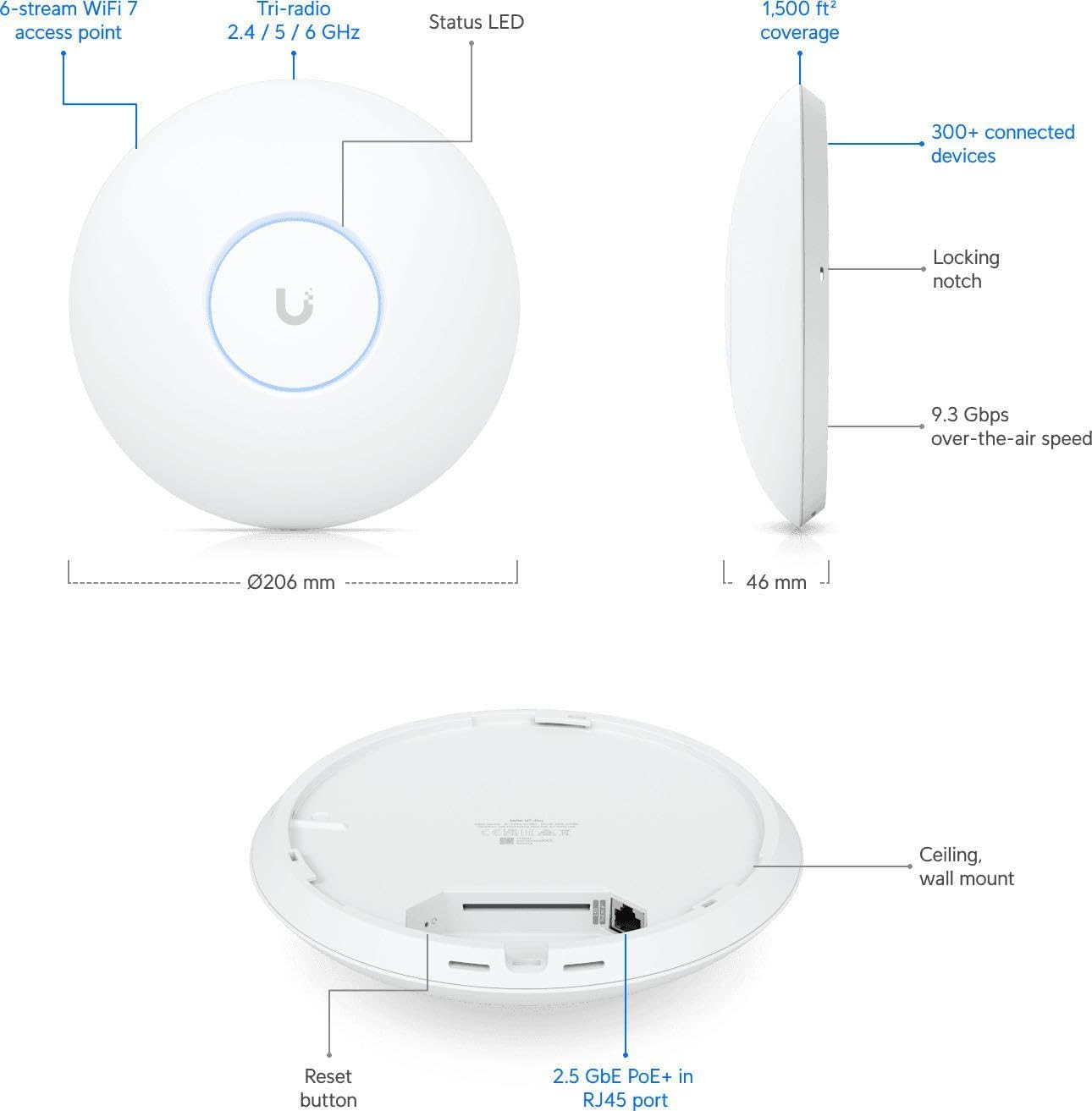 Ubiquiti UniFi U7 Pro Indoor Access Point – WiFi 7 Dual Band, 6 GHz & 2.4 GHz, 5.7 GB/s, 688 MB/s, Supports 300+ Clients
